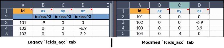 Starting from V3.1.1, legacy spreadsheets lcids_acc need to be modified. The units row (the second row in the input spreadsheet) must be dropped as shown Fig. 131. Running a legacy non-modified spreadsheet will lead to a validation error as shown Fig. 132.