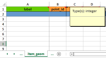 - In each column header a comment is added to indicate the data type of the entry expected. For instance, in the example of Fig. 7, data entered in column B, “point_id” should be