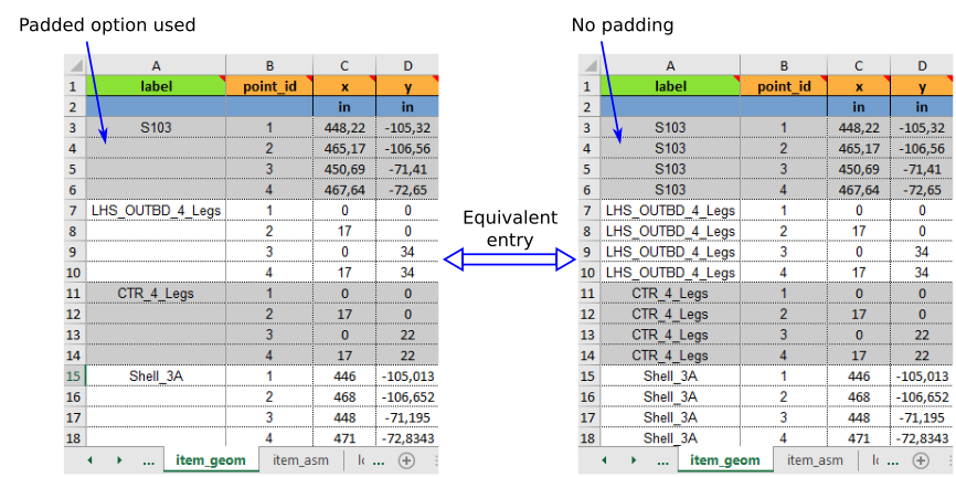 Padded field means that the data doesn’t have to be repeated on each line. The software reader automatically assumes that the entered data is repeated on the blank line below until a new entry is found.