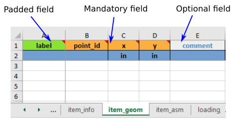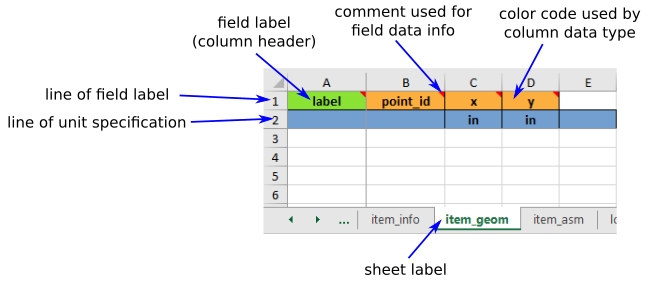 For instance on Fig. 8, in sheet “item_asm” two cross reference fields are specified. In column C, “item_geom::point_id” refers to a ‘point_id’ of the sheet “item_geom”. In column D, “item_info::label” is used to refer to a ‘label’ of the sheet “item_info”.