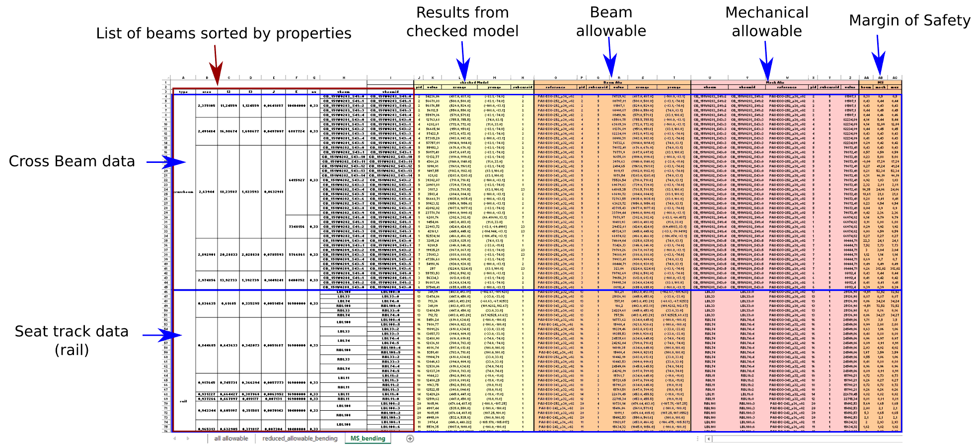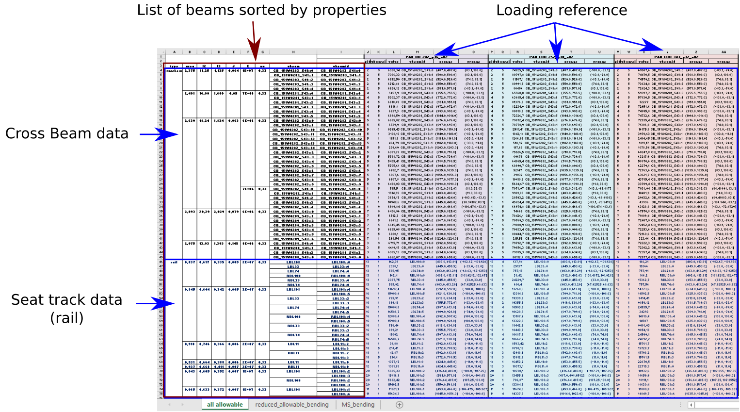 beam_properties: sheet summarizing mechanical properties of all FE BAR elements of relevant structural item (ie: seat track, cross beam or Overwing beam)